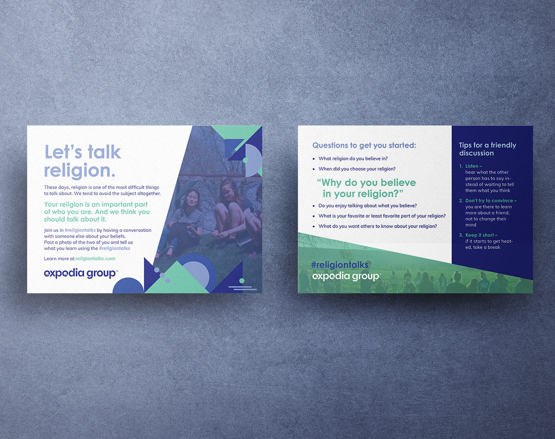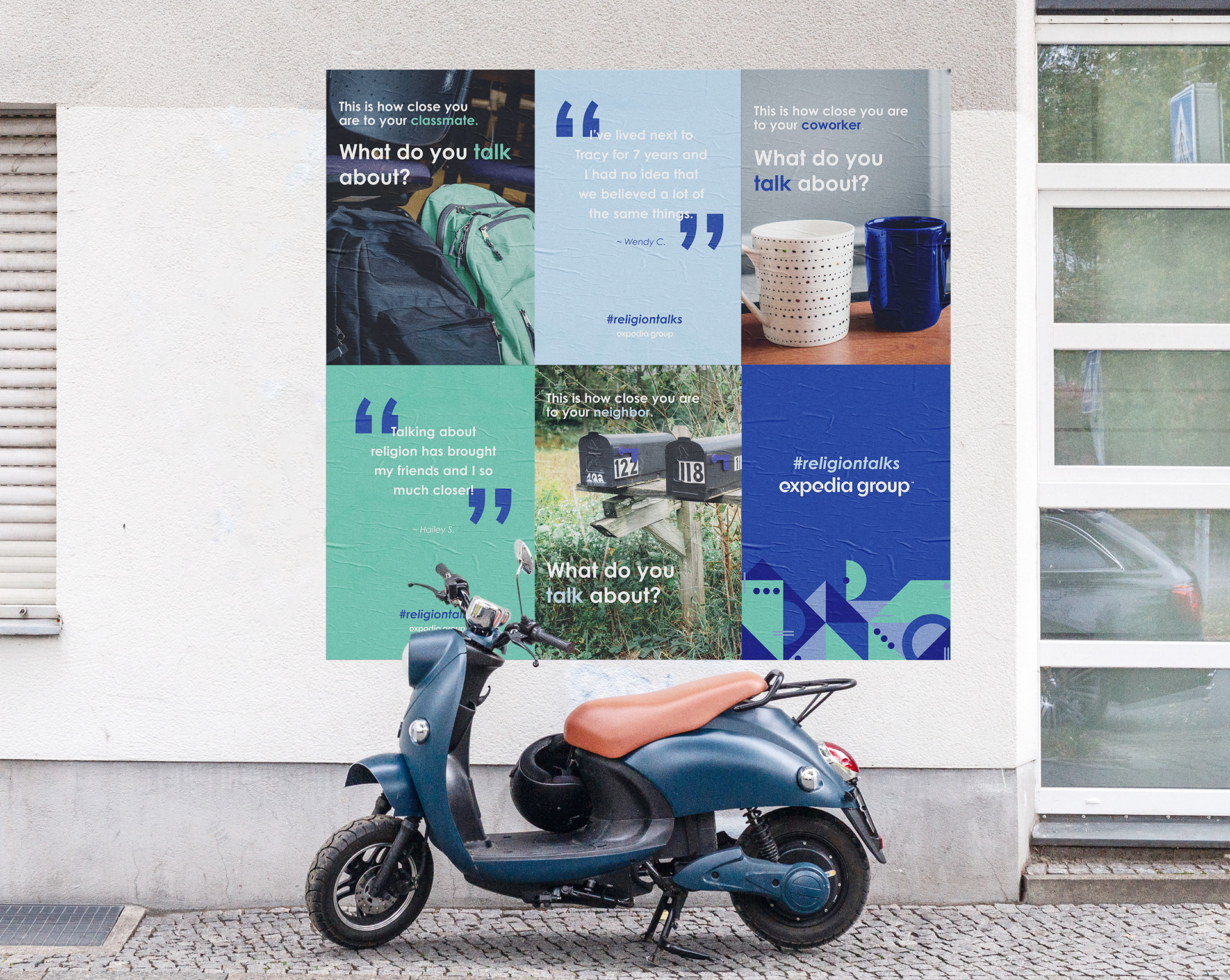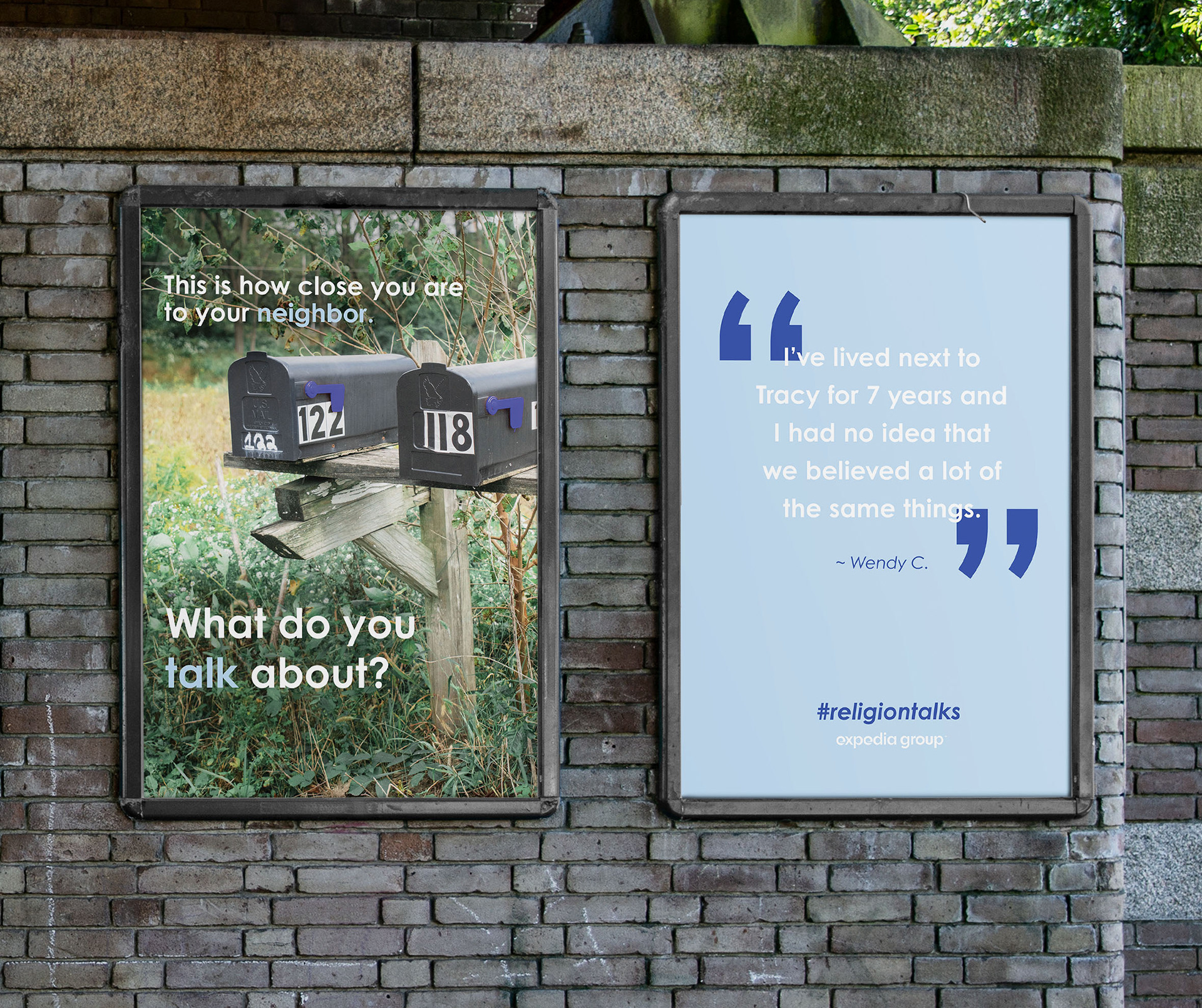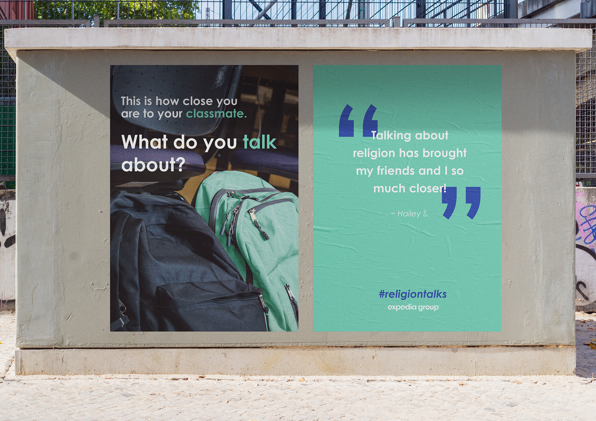 In conversation, most people avoid the topic of religion. With this 360° advertising campaign, Expedia Group takes strides to get people talking about what they believe with those they see everyday. Through the use of existing brand assets, everyone is encouraged to start a conversation. The out-of-home poster series meets people on the streets and in the subways, asking them what they talk to their neighbors, classmates, and coworkers about. The live social feed of #religiontalks is found on the campaign microsite along with more details about how Expedia Group hopes to get people talking.