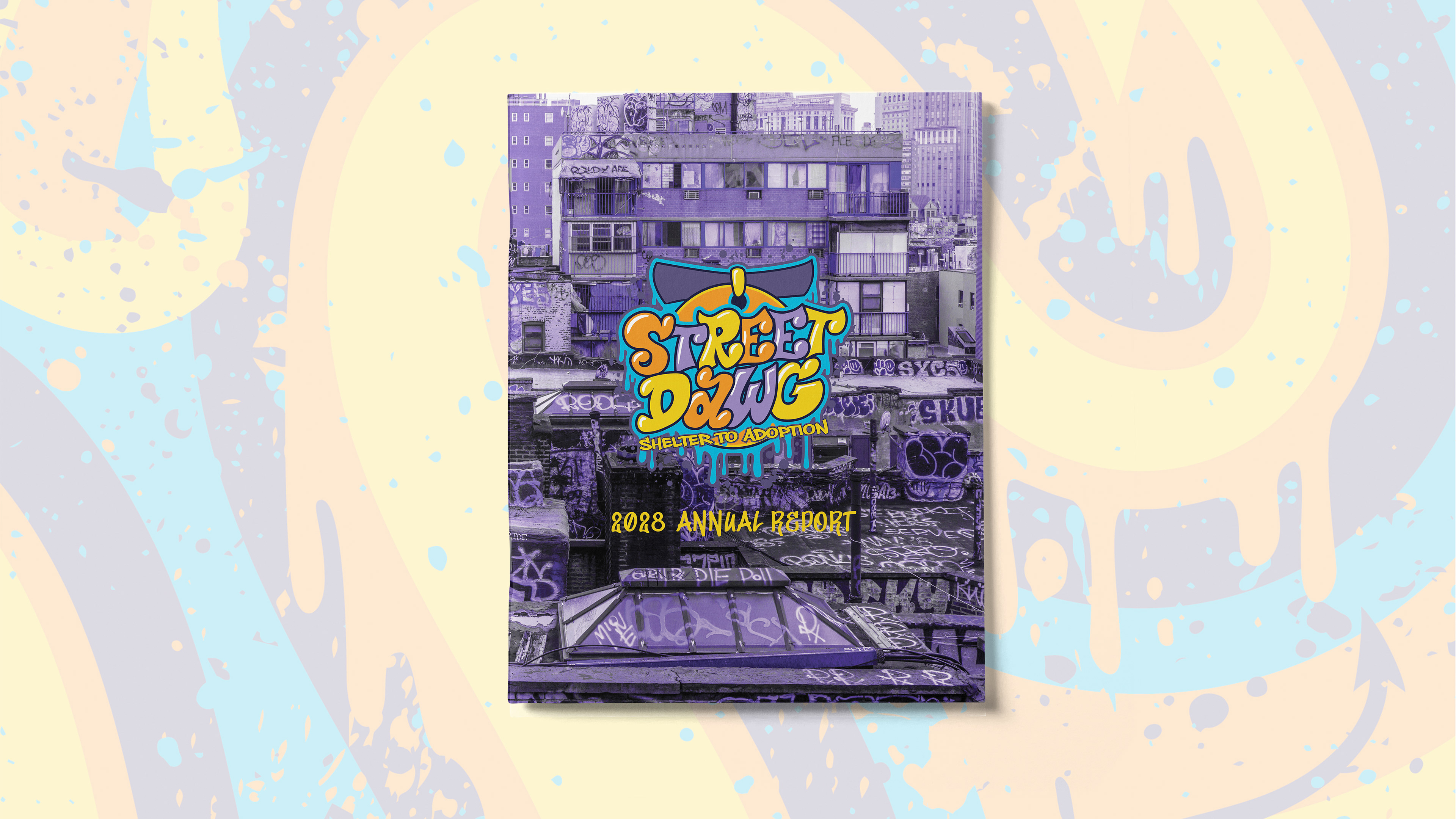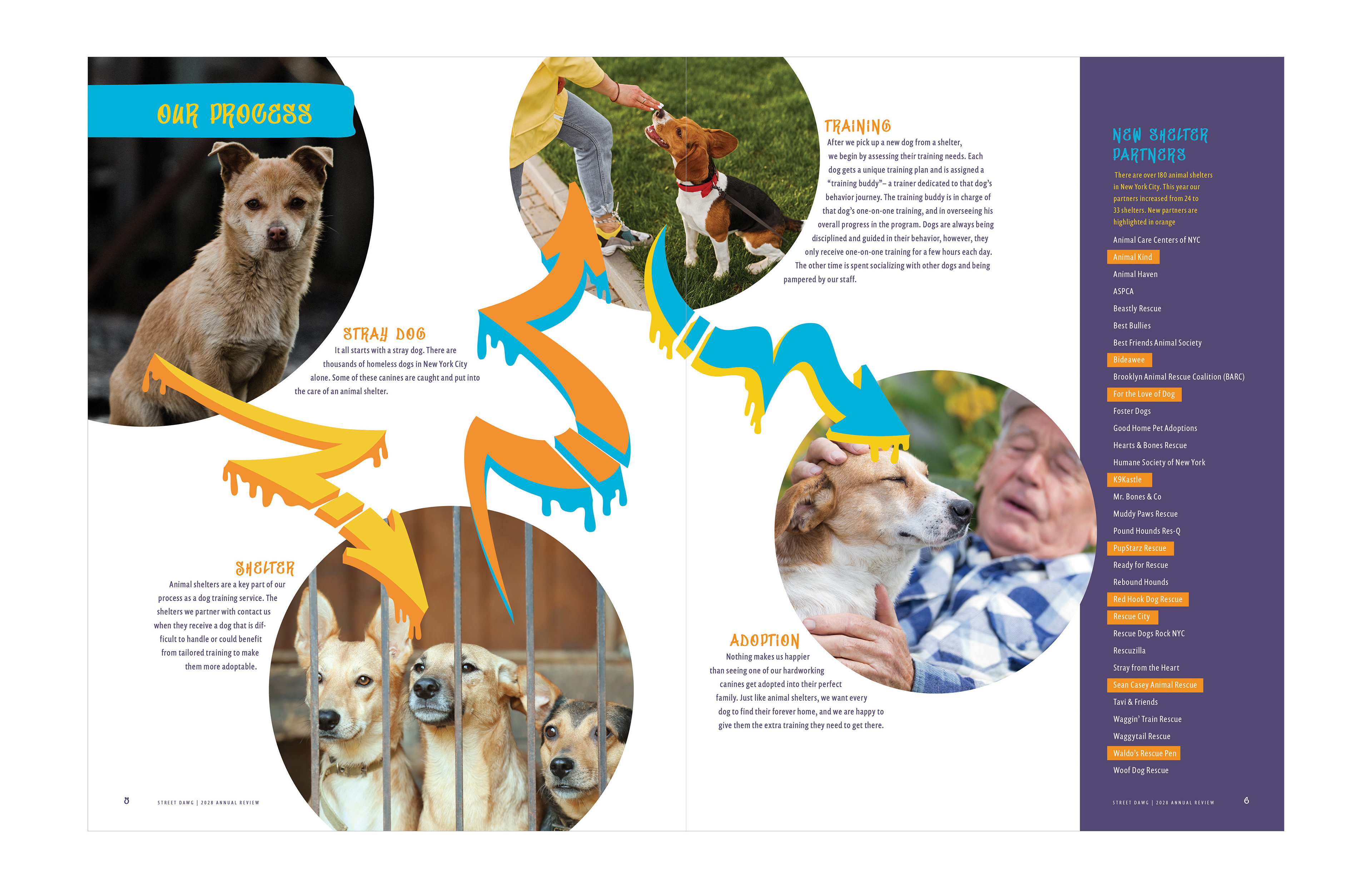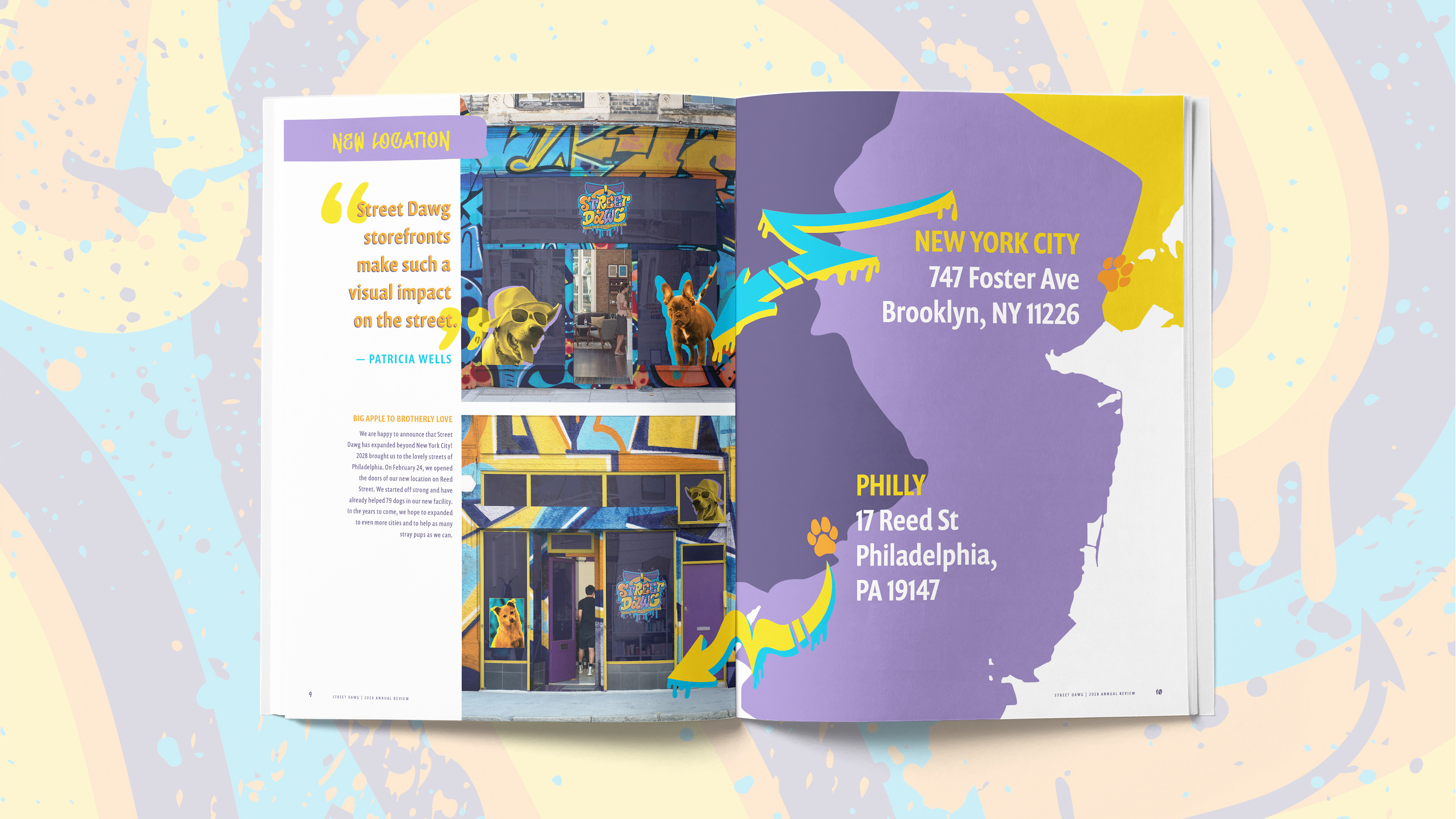 From “ruff” to “paw-fect”: StreetDawg works with New York City animal shelters to train homeless dogs into well-mannered and adoptable pets. Color-screened photography and graffiti-style imagery enhance the pages of the 2028 annual report from this “shelter to adoption” organization. Boasting of a new location, new production methods, and a new marketing plan, each page barks of a fresh way to help pups find their forever homes.