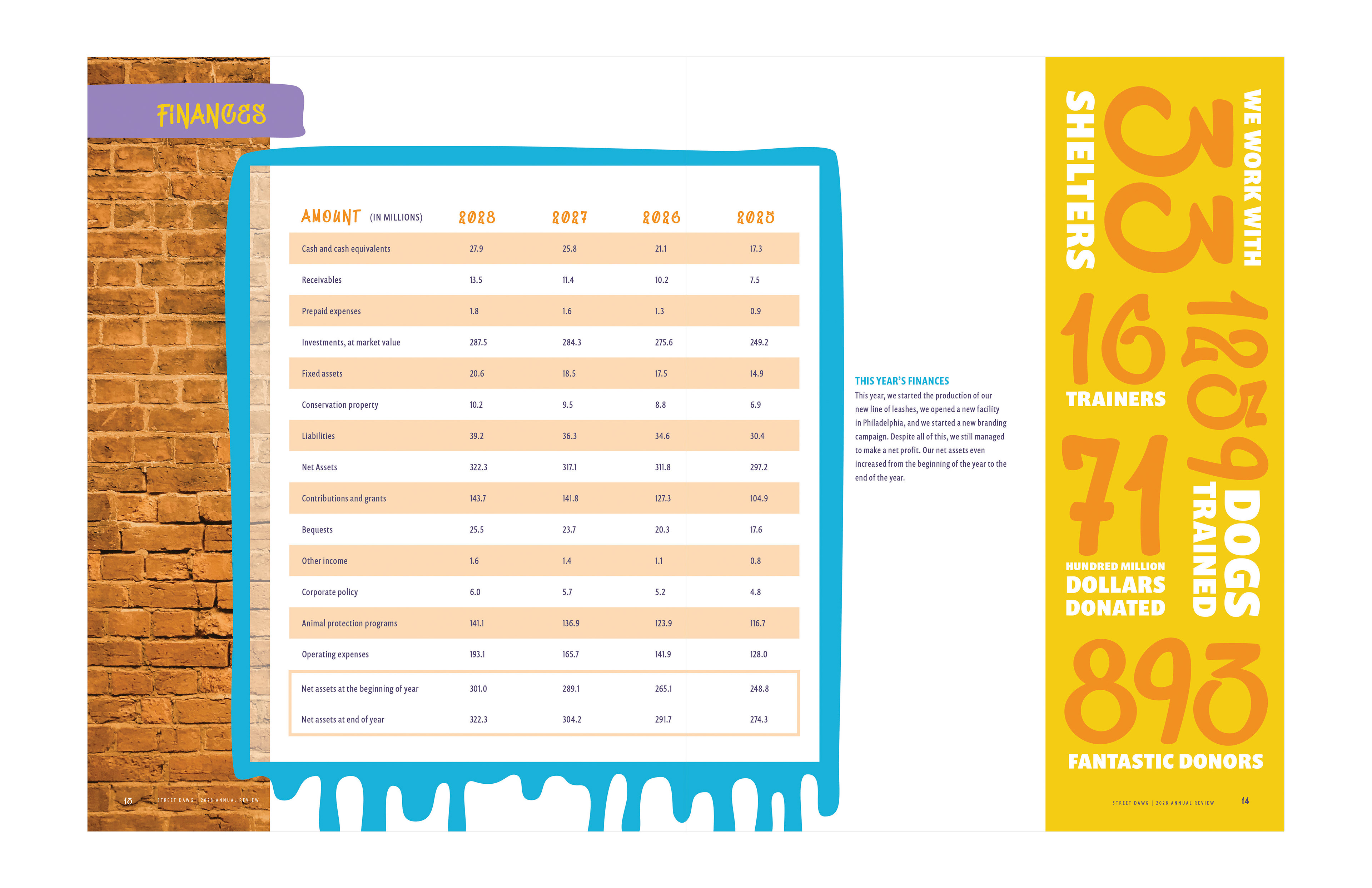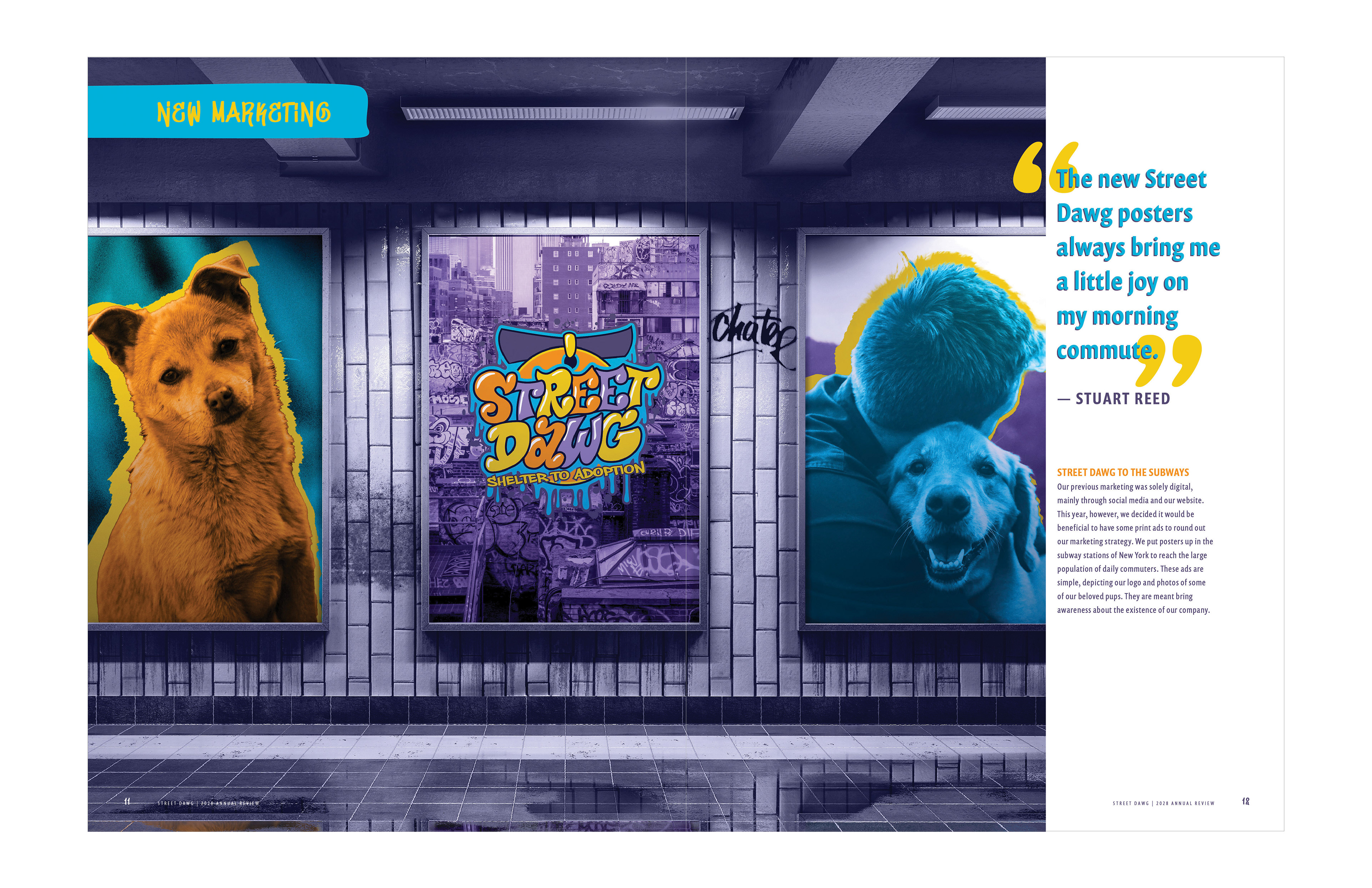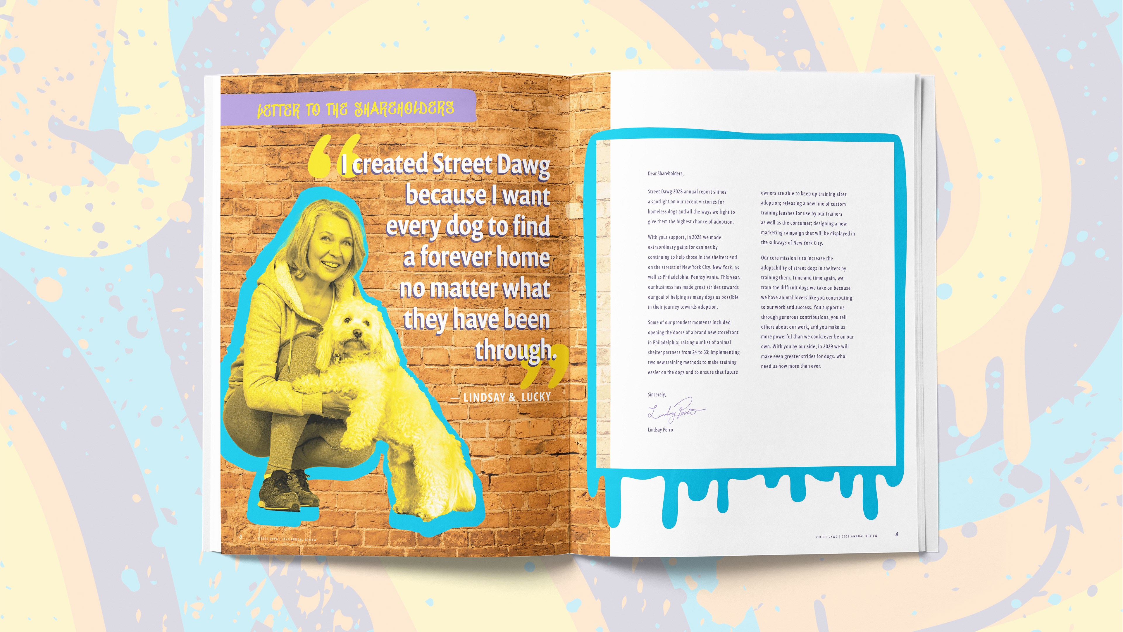 From “ruff” to “paw-fect”: StreetDawg works with New York City animal shelters to train homeless dogs into well-mannered and adoptable pets. Color-screened photography and graffiti-style imagery enhance the pages of the 2028 annual report from this “shelter to adoption” organization. Boasting of a new location, new production methods, and a new marketing plan, each page barks of a fresh way to help pups find their forever homes.